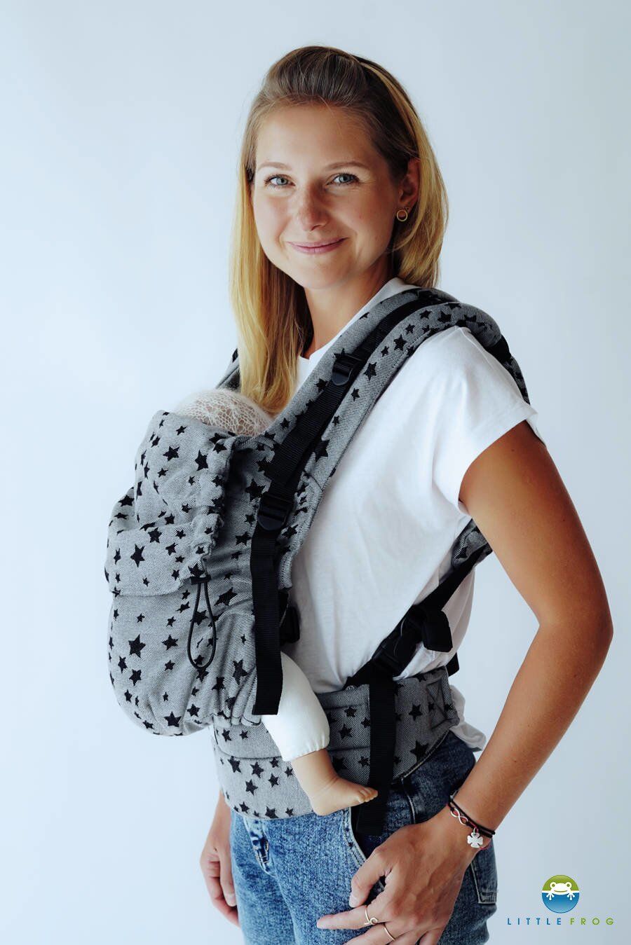 Раницата осигурява правилната М-позиция на крачетата и естествената С-извивка на гръбчето, което я прави отличен избор за първите месеци на бебеносене. Благодарение на регулируемата ширина и височина на панела, Little Frog Prime се адаптира към растежа на бебето и може да се използва продължително време.